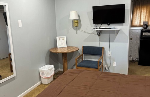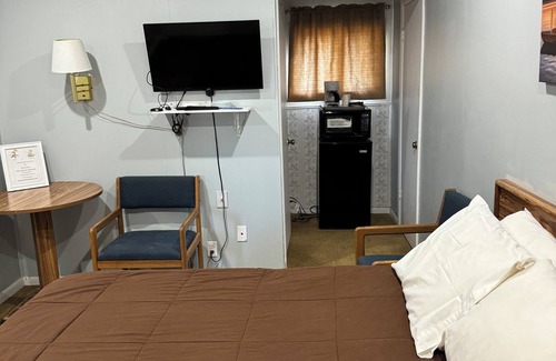 Full bed, includes, microwave, coffee maker, mini fridge, tv, private bath with shower, free internet,