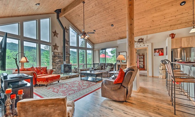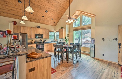 Immerse yourself among the pines at this tranquil woodsy Prescott vacation rental. Nestled on 4 acres of private land, this 2-story cabin retreat boasts 4 bedrooms, 3 bathrooms, forest views, a well-stocked kitchen, a sun-lit great room, a cozy living room, and king-sized beds. Try your luck at Bucky's Casino, spend the day at Goldwater Lake, or take your vacation to greater heights on Granite Mountain. Enjoy dinner al fresco then gather around the fire pit for storytelling and stargazing.