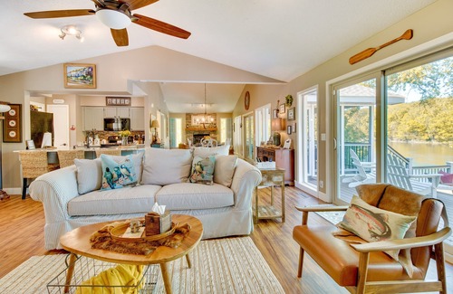With a backdrop of the rushing White River and cabin-inspired comforts, this waterfront Mountain Home vacation rental offers an idyllic retreat! Relax in style at this 2-bedroom, 2-bath home, whether you sip drinks on the deck, gather around the fire pit, or unwind by the indoor fireplace. Discover the beauty of The Natural State nearby with a fishing excursion to Bull Shoals Lake or a hike in the scenic Ozark Mountains!