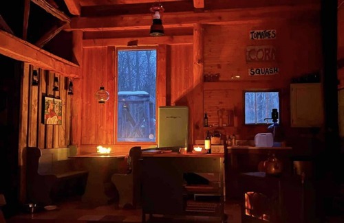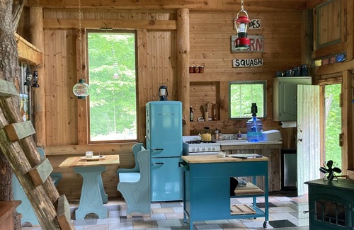 Our delightful off-grid cabin is a great place to disconnect. The post-and-beam cabin is tucked away in a meadow that is often active with birds, butterflies, deer, and turkey. A stream runs nearby, meaning that you can listen to the sound of running water while drinking coffee or a glass of wine on the porch. We love this space and hope that you will too.