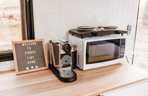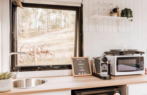 Firefly Tiny House by Tiny Away is set in a secluded bushland area surrounded on one side by semi-cleared paddocks, established trees, and bushland, supplying dappled shade spaces, and flourishing natural surrounds. You can enjoy a generous decked outdoor space to lounge back and enjoy the serenity that our property has to offer.