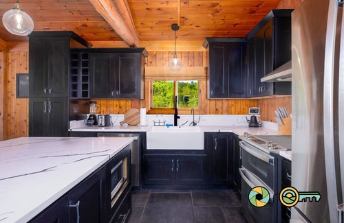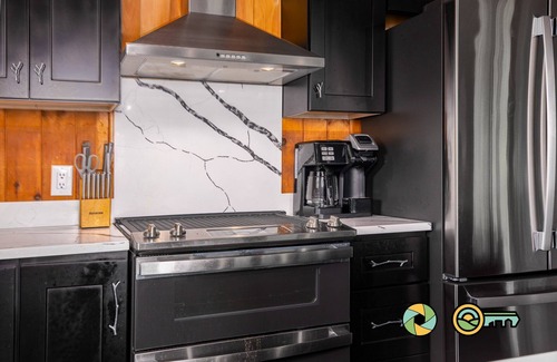 This property elegantly marries modern and rustic aesthetics with an all-wood interior and a beautifully finished, modern kitchen. The open-concept kitchen has sleek black cabinets, stainless steel appliances, a massive island with stunning custom quartz countertops, basic cookware, tableware, a basket-style drip coffee maker (filters provided, but please bring your favorite grind), and a Keurig (K-cups provided). The kitchen blends into the living space, making it perfect for entertaining and staying engaged with family and friends during your getaway. The dining table seats six with additional space for four at the kitchen island. Additionally, the main floor features two bedrooms with queen beds and a full bathroom that offers a stand-alone soaker tub as well as a full glass shower. The lower level also features two bedrooms and a second full bathroom just off of the Rec Room. Both bathrooms are clean, bright, and thoughtfully designed. A stacked Washer/Dryer is located in the laundry room on the lower level; please bring detergent if you plan to do laundry during your stay. Each level features a custom large authentic stone wood-burning fireplace (firewood provided seasonally October-March), providing the perfect focal point for warmth and ambiance on cool days.
