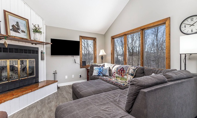 Welcome to our 4 BR, 3-bathroom townhouse. Attractive laminate wood flooring, vaulted ceilings and plenty of windows create a bright and welcoming space. The open concept layout is perfect for accommodating large groups. The spaced-out bedrooms offer privacy with one bedroom on the main floor, master suite on the top floor, and two more bedrooms in the basement. Our townhouse includes smart TVs, gas grill, wood burning fireplace, outdoor firepit, patio furniture, stocked kitchen and more!