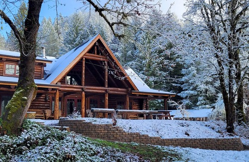 Modeled after a historic wilderness log home, our family cabin is a blend of modern and rustic architecture running on geothermal energy. Featuring 25-foot vaulted ceiling, the main family room offers a relaxing lounge perfect for a wine hour. This beautiful log cabin is truly an unforgettable retreat. Nestled in the heart of Umpqua Valley and resting on the banks of a babbling creek, you will be overwhelmed at the stunning sights and sounds this location has to offer. “The Cabin”, as we call it, has been a family treasure for almost 15 years! Perfect for hosting family vacations, group retreats, or a couples getaway.