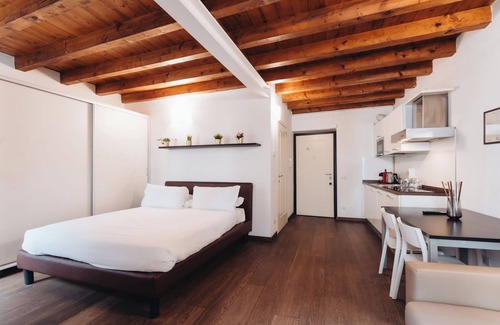 Elegant Studio located in the heart of the historic Brera district, a stone's throw from the famous Pinacoteca. The furnishings and colors chosen are refined, it is characterized by exposed beams and parquet flooring. It is equipped with the most modern comforts including free WIFI, HD television, Nespresso coffee machine with free coffee, tea and sugar pods available.
