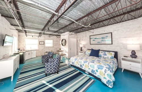 The First Mates Quarters is a comfortable efficiency apartment featuring a King bed kitchenette w/Refrigerator, Coffee maker & Microwave - NO OVEN OR COOKTOP, and private spacious bath. Attractively decorated with a Nautical/Industrial flair. This apartment is located on the 2nd floor with a view of the marina. (Accessed by Stairs only) Conveniently located with Half Shell Dockside Bar & Restaurant on site. Close to downtown. Perfect for boaters and anglers. Max 2 guests. $129/night with a 3-night minimum. Stay 7 nights for the price of 6 - $775. Ask for rates for longer stays and for rental of all 3 units together. 10% Lodging tax & Cleaning Fee will apply.