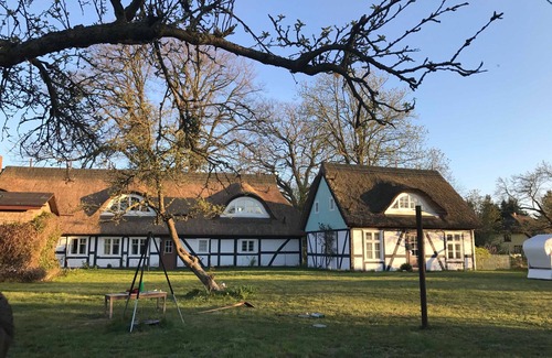 The "old fishery", a historic thatched roof house, with the 3 non-smoking holiday apartments "Kapitänstube", "Heimathafen" and "Fischerkoje" dates in part from the 17th Century and is a listed building. It was completely renovated and modernized in 1997. The associated “trap house” could not be saved and was rebuilt. Both buildings are provided with a thatched roof, a typical roof covering. The owner of this collector's item has tried to take the history, charm and charisma of this house into consideration, even if this means that some modern achievements are missing. All apartments are comfortably and extensively equipped so that guests can feel at home. The houses are surrounded by a park-like, near-natural garden with old trees and spacious lawns. The property is centrally but quietly located in the center of Bodstedt on the south coast of the Bodden of the same name. Equipment: non-smoking, compact stereo system with radio and CD player, television, free internet via W-LAN, shoe drip tray and cloakroom in the entrance area of each apartment.All beds have a size of 90x200cm double beds with single mattresses 90x200cm mosquito screens on the windows of the bedrooms , foldable luggage benches laundry package to be booked, baby equipment (travel cot, high chair ...) on request digital safe (except "captain's room") in the bedroom closet, light wooden floors, blackout curtains, additional blankets and pillows for indoor use, small selection of toys and books for everyone Old, designed brochures, magazines and guidebooks extensive kitchen equipment on cooking and food preparation equipment with mixer / kneader, baking molds and utensils as well as cooking and baking books stove, oven, microwave, refrigerator with freezer and Dishwasher ironing board and a steam iron cleaning equipment such as Vacuum cleaner, broom, hand brush, feather duster, cloth and cleaning agent (cleaning cabinet) Shopping basket First aid case for minor ailments Washing machine (each in the bathroom "home port" and "captain's room") Bathroom equipment with hairdryer, towel hook and bathtub and / or Shower cabin, window The garden of the old fishery is open to all guests and with 3000m2 is big enough for all guests. direct access to the garden (except "Fischerkoje" in the 1st OG) 1 seat with furniture and beach chair per apartment grill grate with fireplace in the back garden shed for brought leisure equipment for games and sports children's play area with swings, sandpit and slide, children's house bike stand covered, 1 car parking space per apartment
