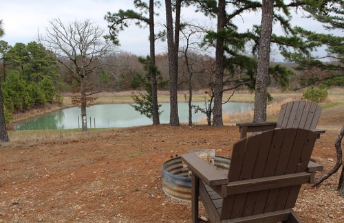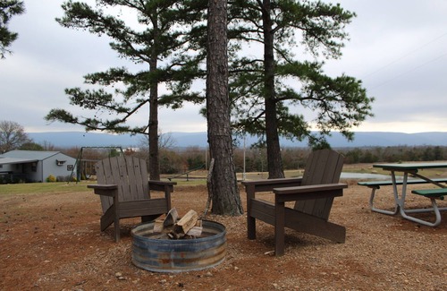 The fish cabin is a great choice for someone traveling alone, a girl's weekend, or a retreat for couples! The cabin includes a kitchenette with a mini refrigerator for your convenience. It includes a fire pit too! It's close to a small fishing pond, so bring your fishing poles! All of the cabins at Mountain View Retreat include fabulous views of the Kiamichi Mountains and the Kiamichi Valley!