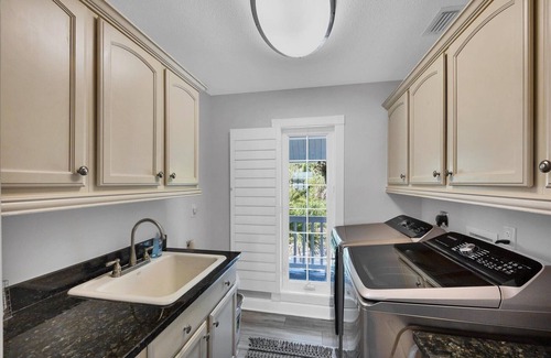 The home is equipped with a 65" TV in the large living room and master bedroom, (perfect for viewing the game or family movies), outdoor speakers, mesh Wifi, washer/dryer - everything you will need.