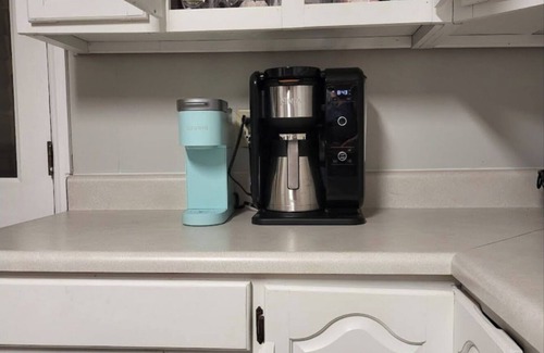 A starter pack of toilet paper, paper towels, dish soap, sponge, garbage bags, shampoo, conditioner, body wash, poop bags, laundry pods, Keurig cups, sugar, honey, and tea is provided. If you need more supplies, there is a grocery store in Blairsville, Blue Ridge, Ellijay, and Dahlonega.