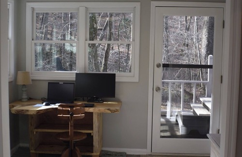The 1st floor of this smoke-free cabin contains a dedicated workspace with wi-fi; spacious kitchen with Keurig coffee maker; dining / living area with electric fireplace in winter; a king bed and ceiling fan in the master bedroom; and walk in shower with handheld shower head in full bathroom.