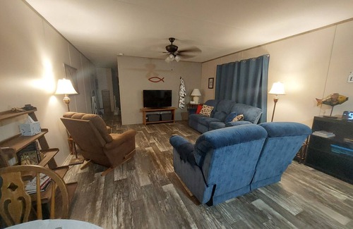 This home sleeps 6 and is perfect for that weekend fishing tournament or hunting trip. There are 2 Flat Screen TV’s, free Wi-Fi access, and a washer & dryer. The living space has two recliner sofas with a total of 4 recliners that are just right after a long day of fishing or hunting.