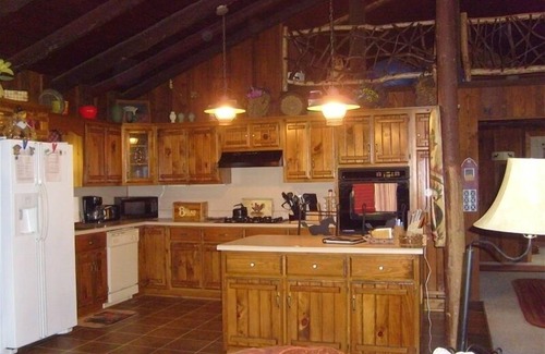 Master bedroom has queen size bed and walk in closet with full bath, even has logs running through the showers--you can't get more country than that! Second bedroom has queen size bed, third bedroom has 2 twin trundle hand made log bed and huge loft now accessible by stairs, has full size bed and small couch (sleeps small child). There is also a pull out full/queen sleeper couch located in the basement game room. Wireless internet is also available, so bring your laptop, but no working allowed! Please refrain from smoking inside the home.