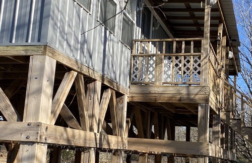 Enjoy your riverfront stay in this tranquil hideaway right on the Tennessee River, Kentucky Lake. This home has a beautiful, screened porch for watching sunsets or sipping your morning coffee. Inside the home find all the necessities for a quiet river stay including high speed fiber internet. The space under the home serves as a great outdoor space with plenty of comfortable seating, and gas fireplace for your evening BBQ. The river frontage of this hideaway is a deck, with handrail, and stairs down to the water where you can dock your boat or go for a swim. Located on the dock is a fish sink for easy cleaning of the day's catch. Nearby is a boat ramp, and you are five minutes from the Crooked Creek Marina, which offers a convenience store with boat ramp, gas, ice, pizza, hand dipped ice cream and much more.