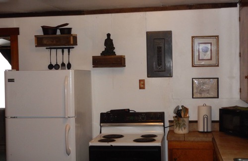 There is kitchen with fridg, electric range , microwave, toaster, coffee maker, dishes pots and pans. There is NO wifi and NO air conditioning.