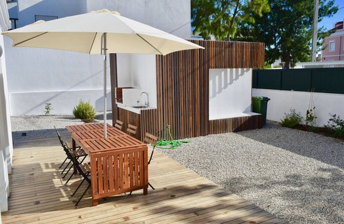The house is completely new and fully equipped. The garden has a deck right outside the living room, easily accessible through glass doors. One of our main objectives when recovering the house is to maximize the flow between indoor and outdoor areas. There is a barbecue next to the wooden deck, with an outdoor dinning area for everyone to enjoy the amazing weather of Lisbon. You can get delicious meat from the butcher, or fresh fish from the market, right on the main square, 5 minutes walk from the house.