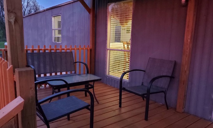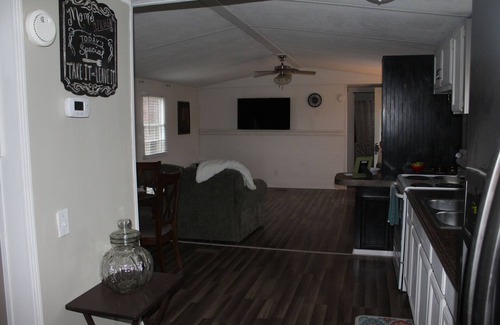This is a mobile home that has been completely remodeled and updated with many modern styles and amenities. It h as 2 bedrooms, 1 with a full size bed and the master suite has a queen bed. The master suite also has a stand up shower and a very nice garden tub. The living room as a couch that has a hide a bed any it. We also have air mattresses if needed. There is a small deck on the front of the house to sit and relax and a bigger one on the back. Sitting out back and relaxing, there is nothing behind there, other than mother nature and tranquility. The proof is in the reviews.