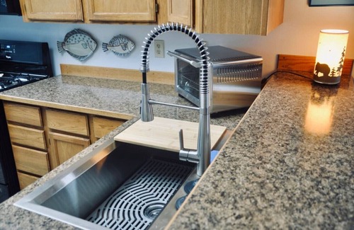 Inside the freshly remodeled townhome, the open floor plan is a design element that brings family or friends together to share quality time and good conversation, effortlessly. The kitchen is fully stocked with cookware, dish-ware, utensils, and features a full-size fridge, gas stove, microwave, toaster oven, blender, dishwasher, large sink with retractable spray kitchen faucet, plenty of cupboard and counter space, breakfast bar and coffee station. (We provide dish soap and soap for the dishwasher.) The coffee station has a Keurig, French press, pour over, coffee grinder, fresh coffee beans, milk-frother, tea, cocoa and popcorn!