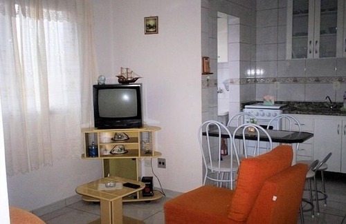 Fit in Vila Caiçara, fully furnished. The fit is less than 3 minutes from the beach on foot. The building has a garage in the basement, with remote control, solarium, barbecue, games room, 24 hour cameras with all security. Fit has a bedroom with double bed, wardrobe, 2 nightstands, 1 mirror, a TV, ceiling fan, and 2 loose mattresses. In the room has 01 double sofa bed, 2 puffs a TV and ceiling fan. The kitchen has a duplex refrigerator and microwave And all necessary utensils, washing machine. New building !!! Impeccable !!! Holds up to 6 people.