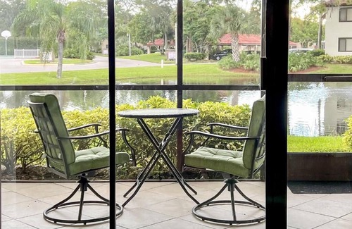 Perched next to a sparkling pond within the Shorewalk resort community in Bradenton, Five Beach Retreat is a beachy two-bedroom condo with a perfect central location. Located on the first floor, you'll enjoy lovely views of the water and surrounding landscape from your screened-in lanai. This home allows you easy access to five of Florida's most beautiful beaches, and the nearby elite IMG Academy. The living space has been fully updated, is open and bright. Two leather sofas are positioned to take full advantage of the pretty views and face the large HDTV. The entire room is bathed in soothing sandy neutrals and crisp sea blues, reminding you of the nearby beaches. An elegant dining table with seating for six leads into the kitchen. The efficient u-shape design has a pass-through window that allows for easy conversation and socializing. Blonde wood cabinets are highlighted by modern recessed lighting and surround the full suite of stainless appliances. The kitchen is fully stocked.