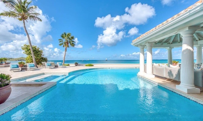 Covered and open terraces, defined by columns and arches, span the length of the villa. The large horseshoe-shaped heated pool sits at the sea's edge. In the center of the horseshoe is a covered loggia for relaxing and dining poolside. A hot tub sits nearby for ultimate relaxation. Additionally, the villa has an on-site manager skilled in taking care of your needs and easy access down the beach to Grand Case Beach Club restaurant and bar.