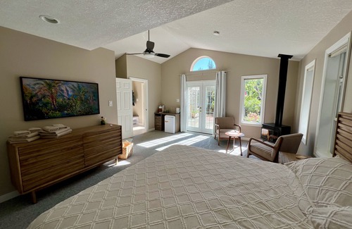 Escape to our peaceful retreat in Qualicum Beach, just 600 meters from the beach. This stylish suite offers a king-size bed, doorless ensuite, and a private entrance overlooking a lush garden. Work remotely in the dedicated workspace, and enjoy the TV, which turns into a stunning piece of art when not in use. Unwind by the gas firepit on the patio or take peaceful strolls through the neighbourhood. Perfect for couples seeking a cozy getaway and a base for island adventures.
