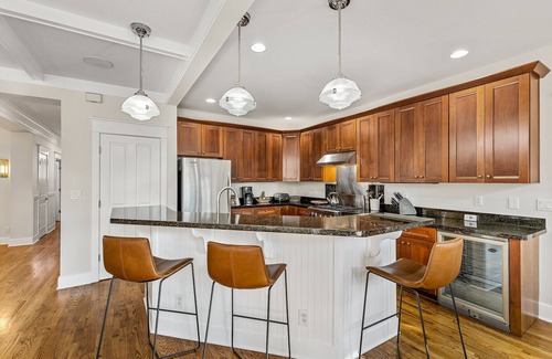 Upstairs master bedroom has king bed, wood burning fireplace, TV, large walk in closet, and large master bath with 2 sinks, small bath tub, and large separate shower. 2nd upstairs bedroom has king bed. 3rd bedroom upstairs has queen bunk bed for KIDS ONLY. Large Bonus Room upstairs has couch and large 70” TV plus a short (74" Long) queen bed built into a nook area for KIDS ONLY or ADULTS UNDER 6' TALL. There is a full bathroom in upstairs hallway with tub/shower combo and one sink. 4th bedroom is downstairs with queen bed and small closet. There is an additional hallway closet to hang clothes. There is a half bath downstairs with toilet and sink.