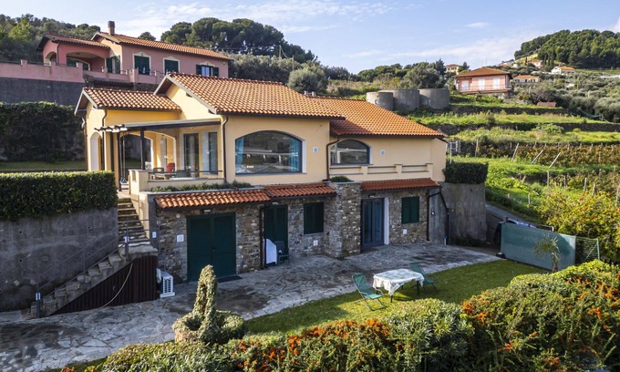 Semi-detached house with two flats. On the ground floor a three-room flat with garden and on the upper floor a large three-room flat with large covered terrace overlooking the garden and private swimming pool for the exclusive use of this flat. Private parking inside the building for shared use. Wonderful view of the sea and the village of San Lorenzo. The house is surrounded by olive trees and vines in the peace and quiet of the countryside about one kilometre from the sea.