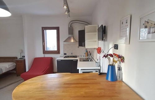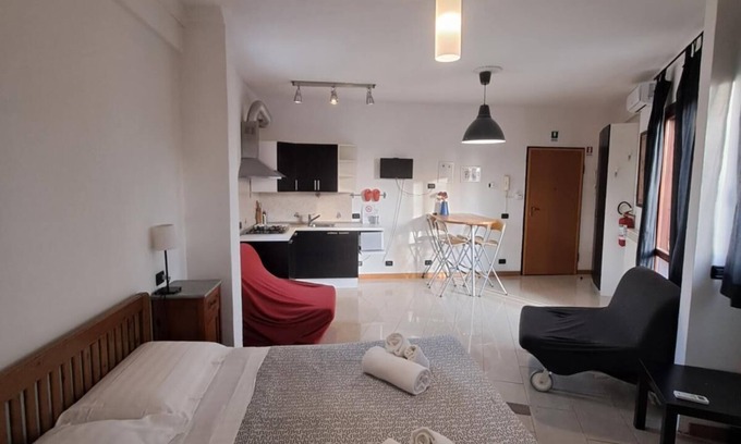 Our studio apartment, Flatinrome Fiera 3, is part of a charming group of small apartments, each approximately 45 square meters and accommodating up to four guests. Located midway between the city center and Fiumicino Leonardo da Vinci International Airport, Fiera 3 is an affordable, fully equipped apartment with reserved parking, air conditioning, free WiFi, and excellent connections to the city center, beaches, and the Fiera di Roma.