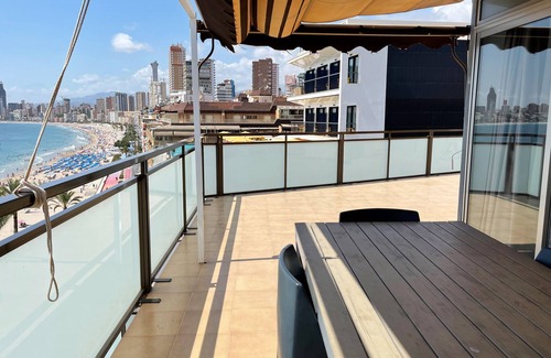 This one-bedroom apartment in Flats Friends Atlántida has access to a large private terrace with spectacular views of the Mediterranean Sea. The apartment has two single beds plus a double sofa-bed in the living-dining room, a separate kitchen and a bathroom with shower. In addition, it has individual air conditioning.It is important to note that, to access the apartment, there is a flight of stairs: the apartment is located on the seventh floor, the highest in the building, but the elevator only goes to the sixth floor.The Flats Friends Atlántida building is located on the beachfront of Poniente Beach, one minute walk from the old town and surrounded by restaurants and cafes, as well as other services such as supermarket, pharmacy... Wi-Fi is included in the price and we accept pets!Due to its excellent location, it is ideal for families and couples who want to enjoy the wonderful beaches that Benidorm offers and who wish to discover a vibrant city full of possibilities.