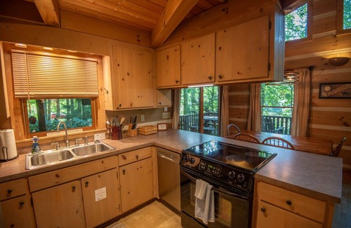Back at “home,” you'll enjoy comfort and convenience in your cozy cabin. The main level offers an inviting open floorplan with a wall of windows for great lake views. Glass doors open to the spacious deck with outdoor furnishings and a charcoal grill provided for your convenience. The kitchen is small but well-equipped for home dinners, including amenities such as a dishwasher and a coffee maker. When dinner is done, snuggle by the cozy fireplace, play games or watch TV. The home comes complete with free wi-fi and satellite TV.
