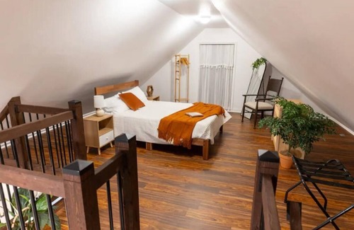 Your guest home has a living area with a 70-inch TV. A full kitchen with a center island for dining and preparing food. Two bedrooms to accommodate three guests. Bedroom one is in the loft with a sloping ladder access. Bedroom two is on the main floor and has office space accommodations. the laundry room has a full-size washer and dryer.