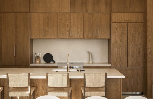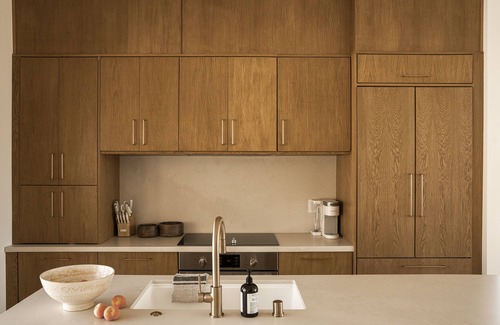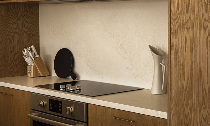Fleur features two freestanding homes, each offering a private, self-contained experience with full kitchens, spacious living areas, and elegant finishes throughout. Floor-to-ceiling aluminum-framed windows frame stunning desert vistas, while custom oak cabinetry, curated designer furnishings, and refined textures add warmth and sophistication.