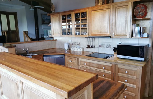 Stocked with quality crockery, glassware, cookware, implements and appliances - microwave, rice cooker, slow cooker, George Foreman griller, and other useful items, the kitchen with its island bench and views, makes meal preparation quick and easy.