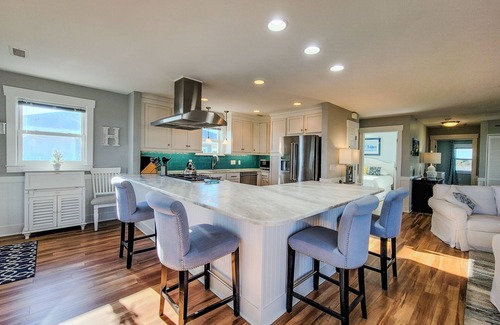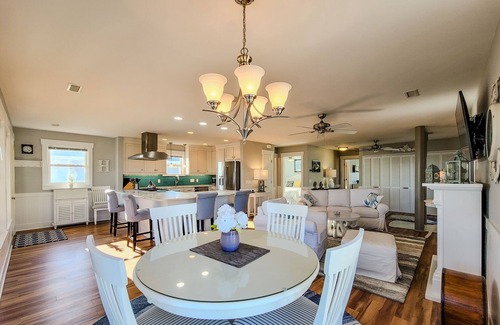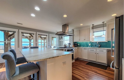 Step inside to discover a bright and airy open-plan living and dining space that’s perfect for flipping between relaxation and connection. The fully equipped kitchen, with its generous countertops and bar seating, is ready to handle everything from pancake flipping in the morning to serving up fresh seafood feasts at night. Just beyond, the cozy screened-in beachfront porch invites you to kick back, listen to the waves, and soak in the stunning ocean views. From here, step straight onto the sandy shores or climb up to the widow’s walk, where the panoramic coastal views are sure to flip your perspective on relaxation.