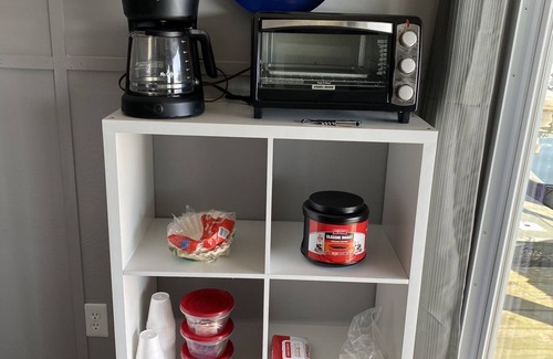 We offer a full size refrigerator, microwave, toaster oven, coffeemaker, and a 4 TV trays.