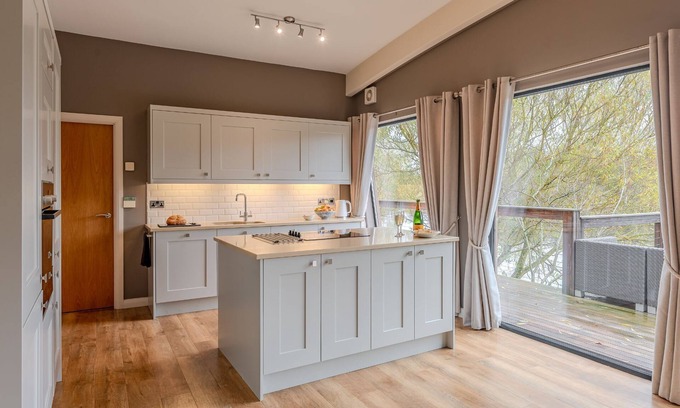 With newly updated interiors that compliment the sunrise view, Flora overlooks the East lake. Couples or groups can enjoy this beautiful lodge throughout the year, and many of our returning guests enjoy returning to watch the seasons change. The open-plan living area features a log burner and private decking from which to enjoy the wildlife on the lake. With the outside area being enclosed, you don't have to worry about young children or your four-legged friends as they are safe. Around Brompton Lakes enjoy the tennis court, borrow a bike, or walk into nearby Richmond which is the gateway to the Yorkshire Dales.