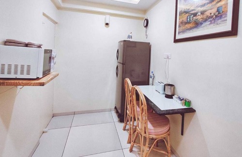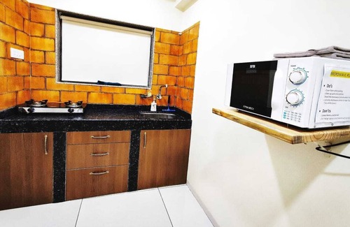 Kitchen: The kitchen is fully equipped with gas range, basic cookware utensils, refrigerator, kettle, basic dinner and serving set, cutlery, tea and coffee amenities and Microwave. It has a small but comfortable two-seater coffee table