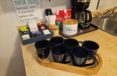 Well-stocked kitchen with everything you need to cook snd serve a full meal, bake muffins, toast bagels, blend smoothies, brew coffee...there is even a hot air popcorn popper. You can also find skewers to make s'mores or hot dogs at the good old fashioned firepit in the backyard.