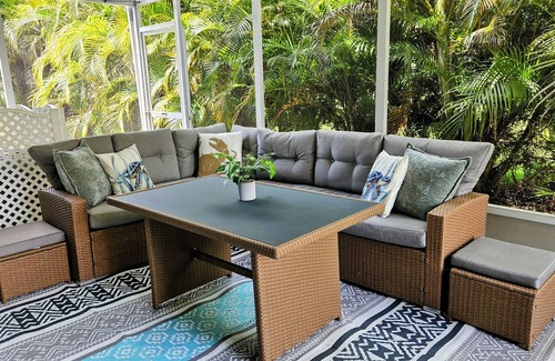 Your cottage also has its own lush, private, screened lanai surrounded by palms, with string lights, lounging for 6, and Bluetooth speaker so you can dine, play games and enjoy your own music in privacy, day or night.