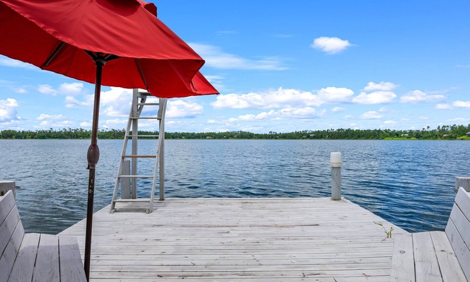 - Lakefront home with amazing sunset/water view, private dock, & firepit