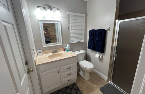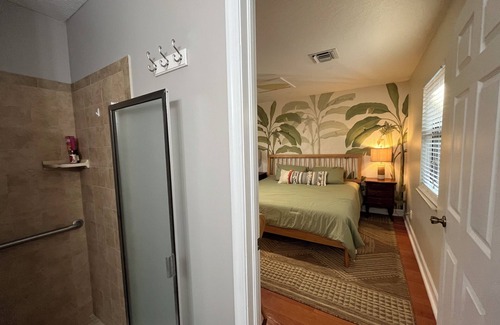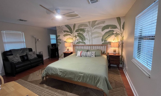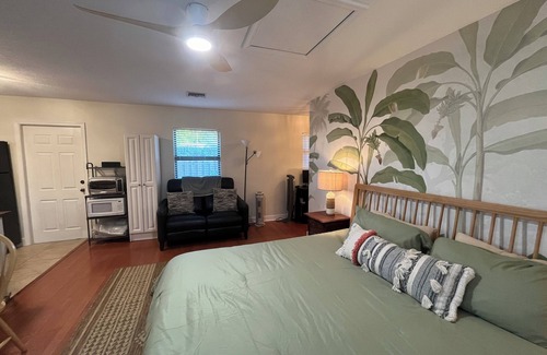 Relax in a sunny, Florida-themed studio with a king bed and a walk-in closet. This cozy apartment includes a kitchenette, high-speed Wi-Fi, and a dedicated workspace—perfect for leisure and work. The apartment is attached to our house but has a private entrance for your convenience. While the backyard and pool are shared, you’ll have a peaceful room in a palm-inspired setting. We’re about a 20-minute walk from shops and restaurants, and a 7-minute drive from the World Equestrian Center.