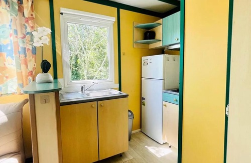 Accommodation: Chalet composed of :- 2 bedrooms (one bedroom with a bed 140X190, the other bedroom with a bunk bed 80X190),- A kitchen equipped with a refrigerator/freezer, a 4 gas hob, a microwave, an electric coffee maker, dishes and kitchenware,- A seating area with sofa and TV, - A bathroom with washbasin and shower,- A separate toilet,- A wooden covered terrace of 15m2 with garden furniture and deckchairs,