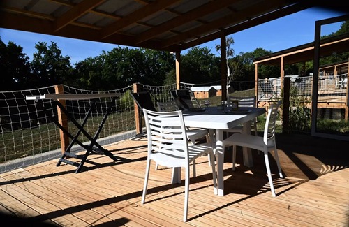 Accommodation: Your holiday at 4 (or less!) in a new mobile home, with all the comfort, from dishwasher to air conditioning, TV, mosquito nets and blinds in the rooms and a beautiful bathroom with large extra-flat shower, towel dryer and hairdryer. And without charge, you will have the beds made before your arrival, towels and towels provided. A large covered terrace with deckchairs and table and chairs allows you to live outside, sheltered from the sun or rain!The pitches are located towards the lake, at the bottom right at the entrance to the campsite.We regret that we cannot accept the animals in this rental.