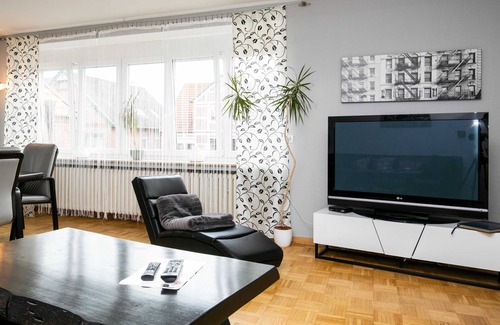Our apartments are spacious and includes everything you would expect from home. The apartments are u. a. equipped with washing machine, flat screen TV, DVD / Video, stereo system and DSL WLAN connection. The kitchens have a dishwasher, oven, microwave and various small kitchen appliances. Our house is located in the Samtgemeinde Lühe, district Mittelkirchen. Within sight is the Elbe and you can watch the ships sailing there on their way to or from Hamburg. Close to our house you will find an EDEKA market and a restaurant with sun terrace, directly on the Lühe. The following transport links are available: bus to Stade, Buxtehude, Jork, Steinkirchen approx. 200 m away; Highway A26 approx. 6 km, S-Bahn connection direction Hamburg - Cuxhaven approx. 6 km; Fährverbindung Lühe - Schulau 4km The apartment house has a garden with several landscaped terraces that can be used by the holiday guests of the apartments. Sun loungers, garden chairs and tables are sufficiently available. Also available to our guests a gas grill for a BBQ.