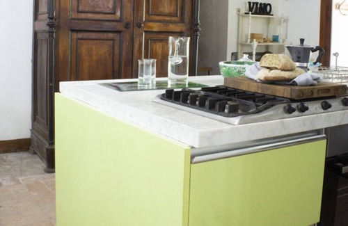 In the closed porch in front of the villa there is a small sitting area and a dining area with a large pink marble table. The porch leads to the two communicating rooms on the ground floor, both with a large fireplace; the first room is used as a living room with satellite TV / DVD and access to both a veranda-study and a service area with bathroom and woodshed; the second room, used as a dining area with a large kitchen island, communicates with a grottino which is the rest of an ancient oil mill.
