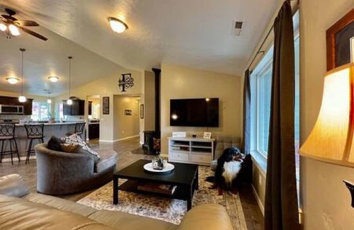 Step into a cozy living room with a wood-burning fireplace, the ideal spot to unwind after an exhilarating day on the slopes at Anthony Lakes. Relax and enjoy the large new smart TV with a YouTube TV subscription. Feel free to login to your streaming account to take in a movie!