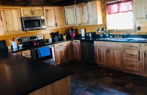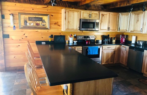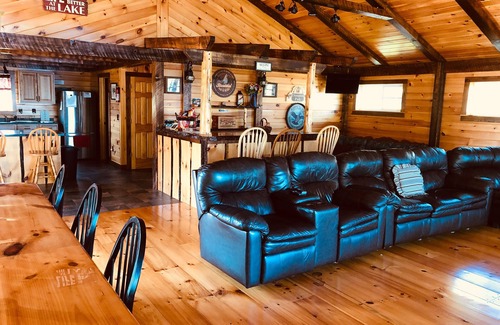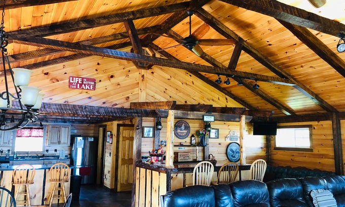 House with privacy! Inside is all pine, hemlock, bamboo, hickory and tile. Beds are custom made from Vermont pine and cedar. Dinning room table is custom made from thick pine and cedar legs. Tiki bar is centered in the great room. Multiple covered and uncovered decks with lake view. If your looking for an upscale waterfront vacation home you should check out our pictures.