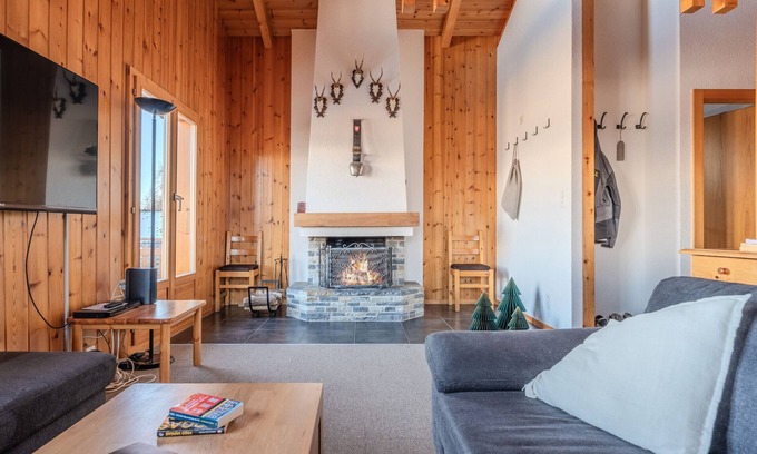FONTANNETS 008 QUIET & SUPERIOR chalet 10 persSleep in this authentic chalet, in a ski resort, ideal for families. Located in Switzerland, in Salins (close to Veysonnaz), this beautiful chalet can accommodate up to 10 people.VIEW OF THE VALLEY – GARDEN – BALCONY – TERRACE – FIREPLACE----------------------------------------------YOUR ACCOMMODATION3* chalet for 10 people with 6 rooms. Bright living room with a fireplace, cable television. Open kitchen equipped with ceramic hob, fridge with freezer compartment, oven, microwave, toaster, filter coffee machine, kettle, dishwasher.- Bedroom 1: 1x double bed- Bedroom 2: 1x double bed- Bedroom 3: 2x single beds side by side- Bedroom 4: 1x double bed- Bedroom 5: 1x double bed- Bathrooms: 1x with shower, 1x separate toilet, 1x with bathtub- Exterior: Terrace with garden as well as a balcony with a view of the Rhône Valley. Outdoor table and chairs- Ski room: possibility to rent a ski locker next to the ski slope at- Parking: 1 outdoor parking near the chalet (subject to availability) / 1x covered parking space included (for additional vehicles, use nearby paid public parking)- Animals: accepted with a weight of less than 15 kilos- Access: by stairsYou are in a Fontannets chalet which enjoys a peaceful location in nature. This hamlet consists of 9 chalets that can accommodate up to 10 people each. Each chalet has a balcony and a terrace offering a magnificent view over the Rhone Valley.- Gondola: 2.9 km- Shuttle bus: 950m- Shops: 2.6 km- Leisure: 2.6km----------------------------------------------WHAT DO YOU NEED TO PAY EXTRA FOR A SMOOTH STAY*? > Bed linen & towels (price depends on the number of guests) > Final cleaning (price depends on the accommodation) > Tourist tax (price depends on the region) > Deposit blocked during your stay and released at the latest 1 month after departure *these services are mandatory and come at an additional cost--------------------------------------------- YOUR ALPVISION BENEFITS + Access to the public swimming pool included during summer/winter (the pool is closed during low and mid-season. Opening hours are available on site and are subject to change) + Access to the Veyson'Action activity program for children and adults included during high summer season (transportation and equipment rental fees are extra)+ Enjoy a wide range of benefits with the Sion Tourist Office guest card+ Many discounts with our partners: up to 50% off on your equipment rental and much more...discover them on our Benefits page ---------------------------------------------- OPTIONAL SERVICES FOR YOUR COMFORT (ADDITIONAL CHARGE) > Beds made and more… (comfort service including your beds made on arrival, towels, and toiletry) > Pet fee (tax + final cleaning mandatory for stays with pets) > Treat yourself during your holiday! Gourmet basket, baby equipment, late departure... Contact us for more information, we have what you need to make your stay even more special. > Take additional bed linens and towels and/or replace them during your stay---------------------------------------------- ALPVISION RESIDENCES Creator of authentic stays in the Swiss and French Alps for over 20 years. Let yourself be pampered by our talents for an unforgettable holiday and live new memories with us! Welcome Home, Your Alpvision team