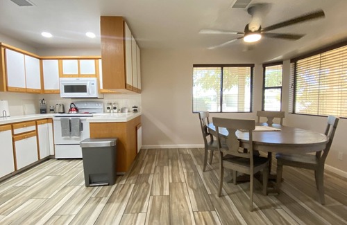 Relax and escape from the desert heat in the pool during the summer or enjoy the heated pool and warm sun in the winter. This quiet home has a lot to offer. Enjoy time at the pool or watching a movie in the reclining sofas, or take a walk to the Sunshine Cafe for coffee and breakfast.